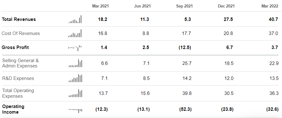 Revenues for the latest reported quarter represented a growth of 48% over the previous quarter and a whopping 124% increase compared to 2021. On the other hand, there was a reduction in gross margins due to unforeseen expenses related to the acquisition of SolAero, a company specializing in solar panels for space vehicles. Rocket Lab acquired the company in January of this year for $80 million. There were also additional overhead expenses related to a delayed launch in the first quarter.