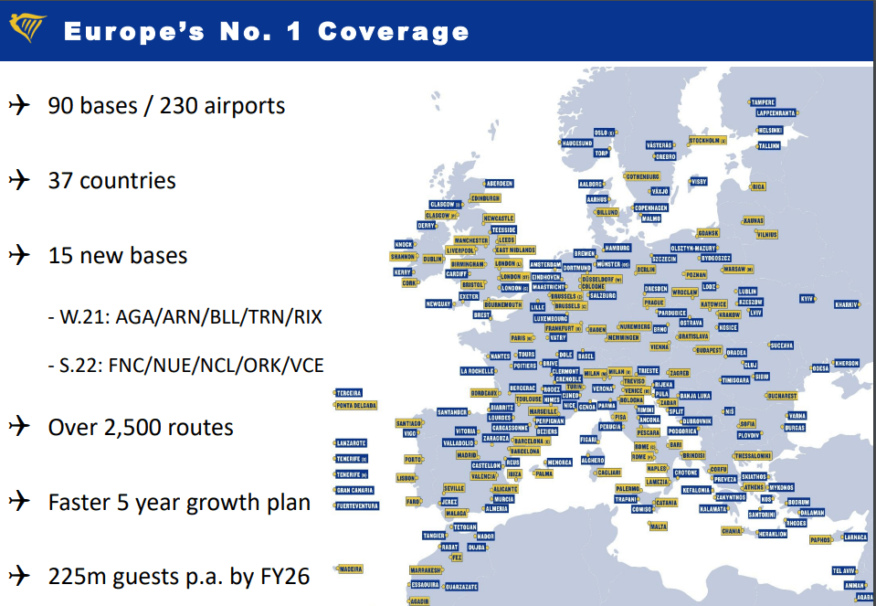 Ryanair Holdings plc (NASDAQ:RYAAY, OTCPK:RYAOF) is the holding company for Ryanair Limited the European low-fares operator. The company (RYAAY, OTCPK:RYAOF) also provides various ancillary services such as marketing of car hire and accommodation services, travel insurance, F&B and many others. Looking at Ryanair’s latest investor presentation, it had a principal fleet of approximately 560 aircraft and offered approximately 2,500 routes per day serving approximately 230 airports. Ryanair Holdings was incorporated in 1985 and it is headquartered in Swords (Ireland).