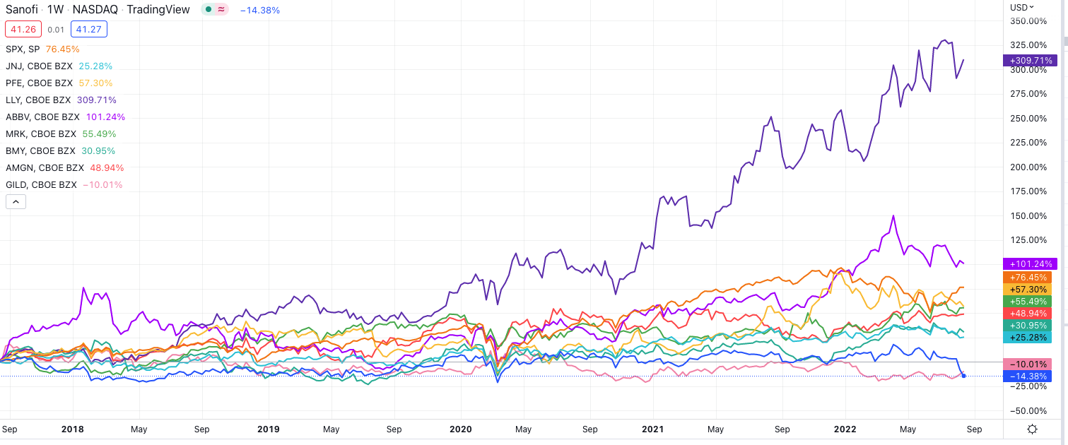 Share price performance of “Big 8” US Pharmas + Sanofi – past 5 years. (TradingView)