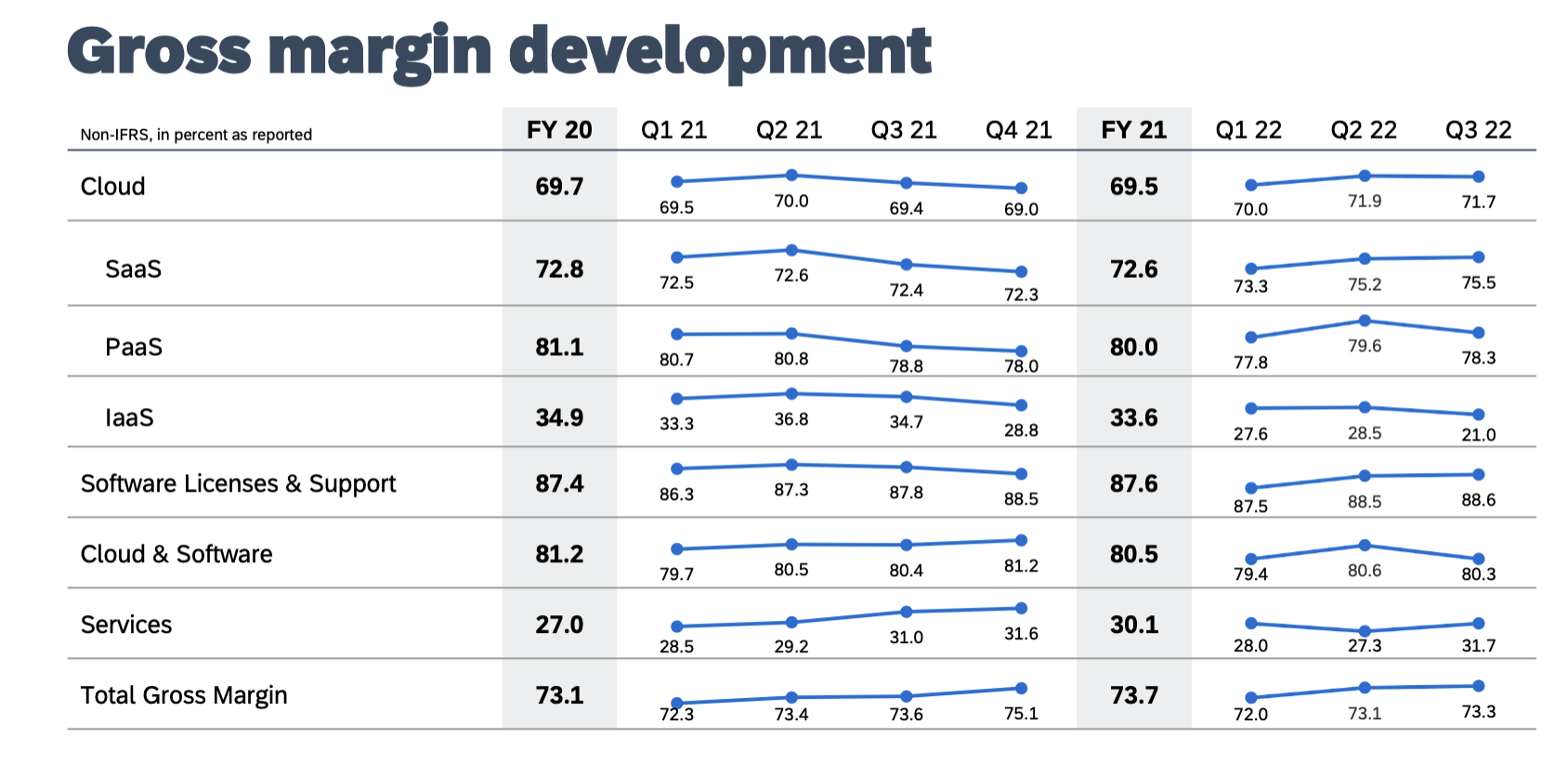 SAP also delivered a 230bps boost in cloud gross margins to 71.7%, driven by economies of scale on the company’s cloud infrastructure platform: