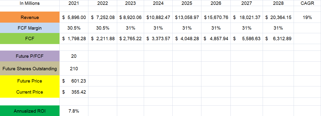 This time I went a bit more aggressive on the revenue growth rate, just to prove my point, projecting a CAGR of 19% for the next 6 years. I kept the FCF margin at 31%, about the same as it is now. I believe 31% is pretty rational as it is high enough for a SaaS business but low enough to cover the case of the increasing competition that will cause margin pressure. Add to that a P/FCF of 20 (which is also a bit aggressive if we take into consideration the fact that historically, the S&P 500’s average P/E ratio has fluctuated between 13 and 15) and you get a future price of $601.26 in 2028.