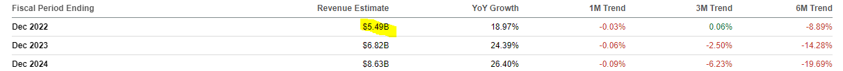 Our own estimates for 2022 were just $5.2 billion when we wrote about SHOP the last time around (See, Bear Thesis Proceeding Flawlessly). Those were based on expectations of a sharp deceleration in consumer spending. Based on the strength in the consumer, we have no choice but to upgrade our estimates for 2022 to $5.5 billion.