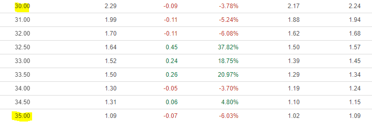 Ratio Call spreads have three components. One long call purchased, and two short calls sold at a higher strike price out-of-the-money. The short calls will generally have the same strike price, although there is no fixed rule on this. All three options have the same expiration date. Ratio call spreads may be opened for a net debit or a net credit, depending on the pricing of the options contracts. In the case of SHOP we would look at the December 2022 $30 and $35 strikes.
