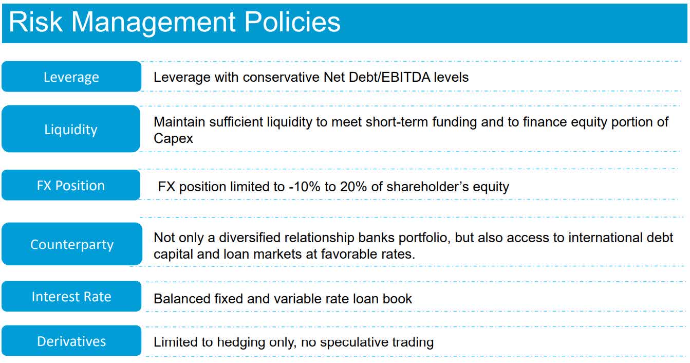 Among the things it’s doing to that end are maintaining leverage at a conservative net debt/EBITDA level, limit derivative to hedging alone, have its Fx position be limited to no more than 20 percent of shareholder equity, and have enough liquidity in order to meet short-term funding and finance Capex.