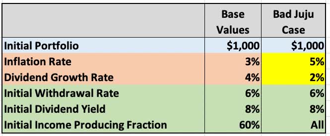 This table shows the base case and the “Bad Juju” case. The Bad Juju case has a 5% inflation rate and 2% dividend growth rate over the 30 years. To my eyes these rates are a worst case or worse (again barring Black Swans). Brief comments follow.