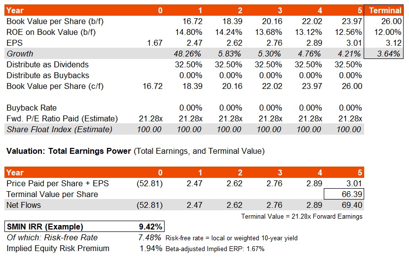 Meanwhile, equity risk premiums are not typically expected to fall too far out of bounds (often 4.2-5.5 in mature markets). Therefore, my indicative valuation that suggests that SMIN is trading with an ERP of sub-2% is evidence of over-valuation.