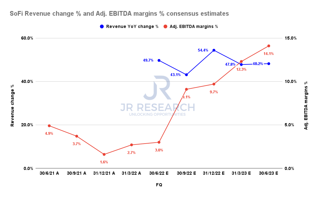 SoFi revenue change % and adjusted EBITDA margins % consensus estimates (S&P Cap IQ)