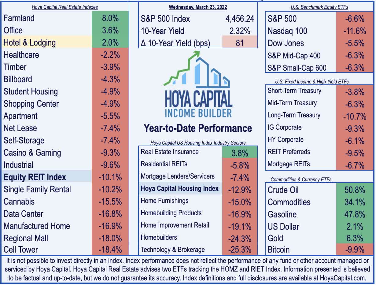Disclosure: Hoya Capital Real Estate advises two Exchange-Traded Funds listed on the NYSE. In addition to any long positions listed below, Hoya Capital is long all components in the Hoya Capital Housing 100 Index and in the Hoya Capital High Dividend Yield Index. Index definitions and a complete list of holdings are available on our website.