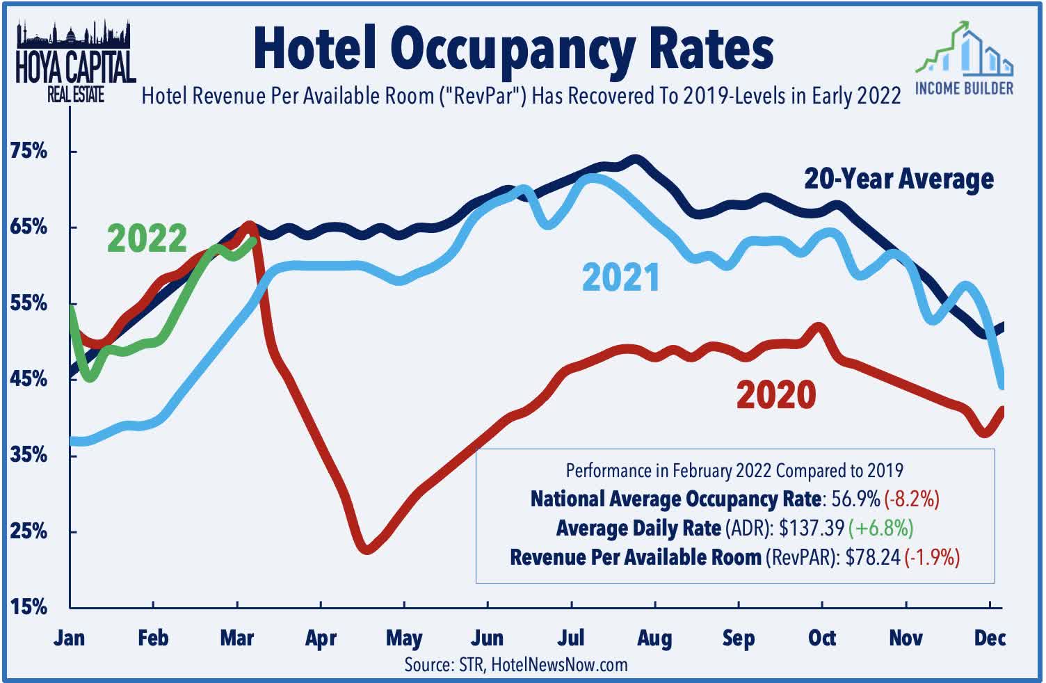 Hotel occupancy – which is closely correlated with domestic airline travel – has exhibited similar resilience over the past two quarters and climbed back above the 20-Year average in late February and early March. According to data from STR, average hotel occupancy was within 8% of 2019-levels during the month of February while Average Daily Rates (“ADR”) were nearly 7% higher than 2019, resulting in an average Revenue Per Available Room (“RevPAR”) that was essentially even with pre-pandemic levels. AirDNA, which tracks travel demand, reported that the booking pace is 49% higher than 2021, and 26% higher than pre-pandemic 2019, and noted that rising fuel prices and geopolitical tensions are having the effect of pushing the demand mix from international trips towards domestic or North American destinations.