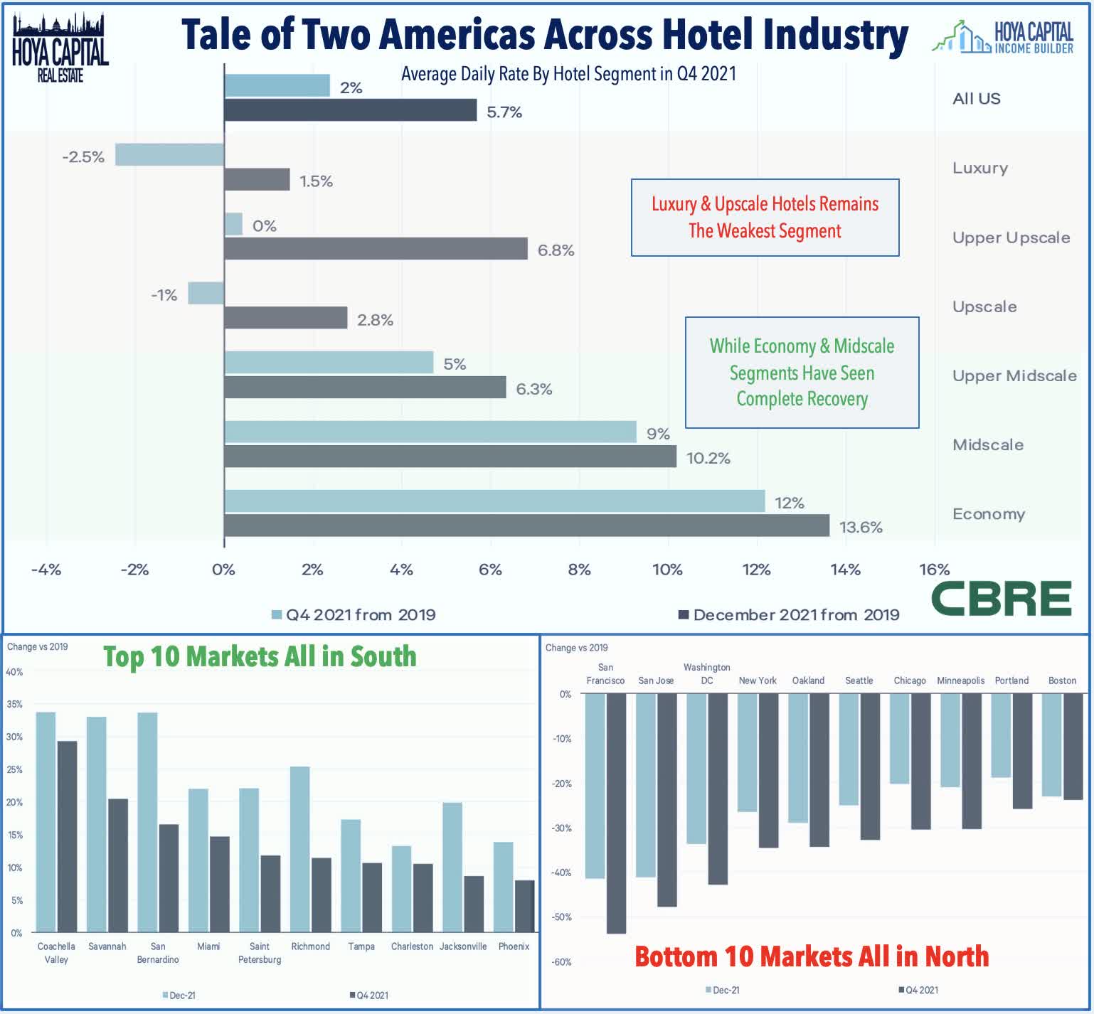 While the national trends are undoubtedly encouraging, it does hide the sharp divergence in the performance between Sunbelt-focused hotel markets and Coastal-focused hotel markets. Per recent CBRE data, the Top-10 performing markets in Q4 2021 were all in the Southeast or Southwest regions with average RevPAR of 14% above 2019-levels. The Bottom-10 markets were in Northeast or Northwest urban destinations with average RevPAR 37% below 2019-levels. Resort, interstate, and small-town hotel RevPARs all exceeded Q4 2019 levels in Q4 2021. Urban hotels remained at just 74% of pre-pandemic levels while airport hotels have recovered 86% of prior levels.