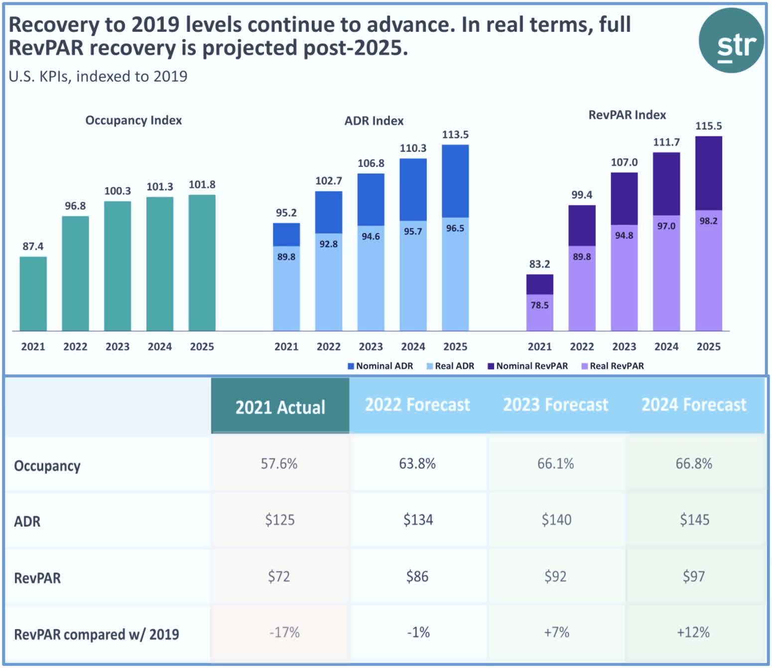 STR – the leading hotel industry research firm – upgraded their U.S. hotel forecast in late January, but raised caution about the impact of inflation, labor shortages, and unevenness across markets. STR now believes that average daily rates (ADR) will exceed their pre-pandemic level by 3% in 2022, while revenue per available room (RevPAR) is projected to be within 1% of pre-pandemic levels in 2022. STR commented, “The industry recaptured 83% of pre-pandemic RevPAR levels in 2021, and momentum is expected to pick up after a slow start to this year… looking beyond the first quarter, the backdrop for sustained travel recovery is strong,” citing an improving public health situation, sturdy labor market, and healthy consumer balance sheets.