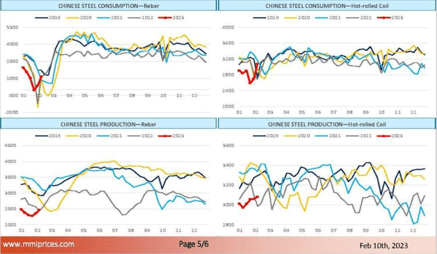 Figure 3 shows that Chinese rebar production increased sharply in the past two weeks. For the week ending 10 February 2023, Chinese rebar production was just about equal to the same week a year ago. Also, it shows that Chinese hot-rolled coil production in the week ending 10 February 2023 was more than the same week last year. Furthermore, Chinese rebar and hot-rolled coil consumption increased sharply in the past three weeks.
