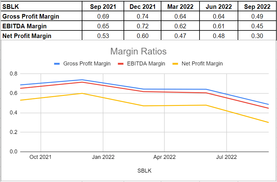 In general, margin ratios evaluate the ability of the company to turn revenues into profits in a number of ways. Overall, due to the shortcomings of the dry bulk market in 2022, this shipping company had weaker gross profit, EBITDA, and net profit margins compared with the end of 2021. In minutiae, the total revenue of Star Bulk declined by 12% from $417.3 million in 2Q 2022 to $364 million in 3Q 2022. A decline in revenue combined with the lower level of profits and EBITDA led to lower margin ratios in the second quarter of 2022.