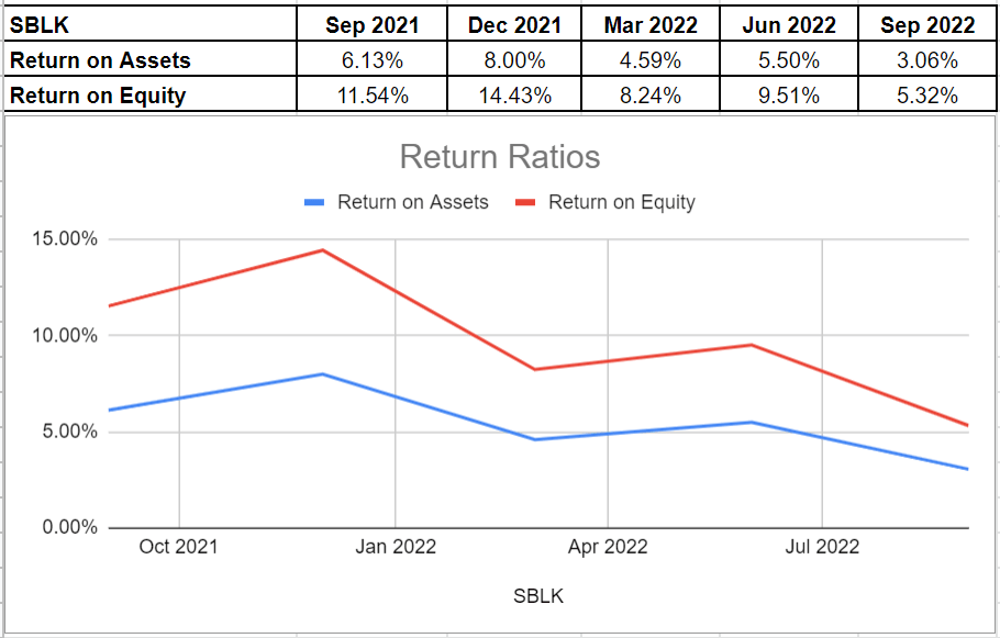 I looked into SBLK’s return on equity and return on assets ratios to show how well the company can tailor returns to its shareholders. The ROA ratio illustrates the amount of profit a company may produce for each dollar of its assets. The ROA ratio of 3.06% for Star Bulk Carrier in 3Q 2022 decreased by 307 bps year-over-year compared with its level of 6.13% in 3Q 2021. Additionally, its return on equity of 5.32% in the third quarter of 2022 is far lower than 9.51% and 11.54% in 2Q 2022 and 3Q 2021, respectively. ROE ratio shows the company’s net income concerning shareholders’ equity and is important since it calculates the rate of return on the capital invested in the business. The company’s net income of $200 million dropped considerably in the second quarter of 2022 to $109.7 million in the third quarter of 2022 and thus affected its return ratios. It means that the return ratios of Star Bulk could indicate that the return circumstances of the corporation weakened due to the deficiency of the dry bulk market; to be honest, I anticipate similar results for the fourth quarter of 2022 (see Figure 5).