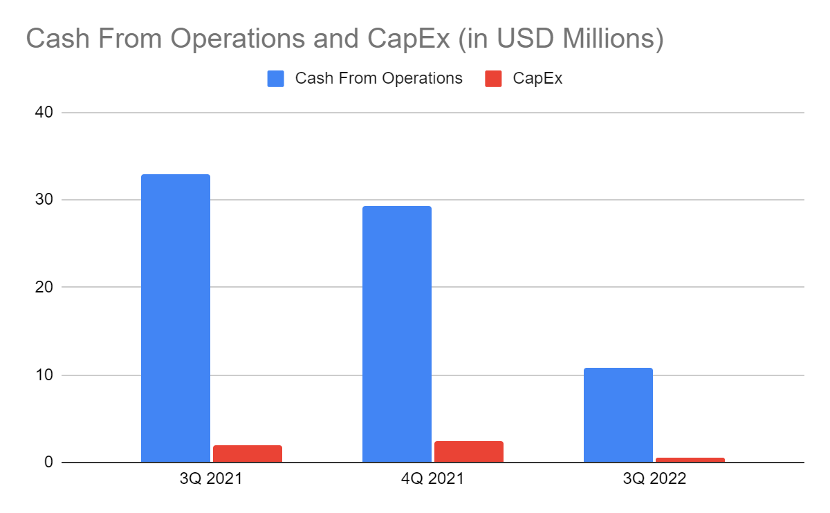 The drastic increase in expenses came from other components, particularly credit loss provisions. It amounts to over $30 million, up from only $254,000 in 3Q 2021. Even so, the company’s actions are still on the right track. Increasing provision losses is prudent after the insolvency of one of its primary contractors. Although the event is unrelated to SUNL, re-underwriting is the best option to ensure a realistic value of advances and hedge risks to its performance. Provisions are non-cash adjustments, but they directly impact Sunlight’s viability and the advances it can collect. Its operating margin dropped to -120%, slightly better than 3Q 2021 but way lower than the first two quarters.