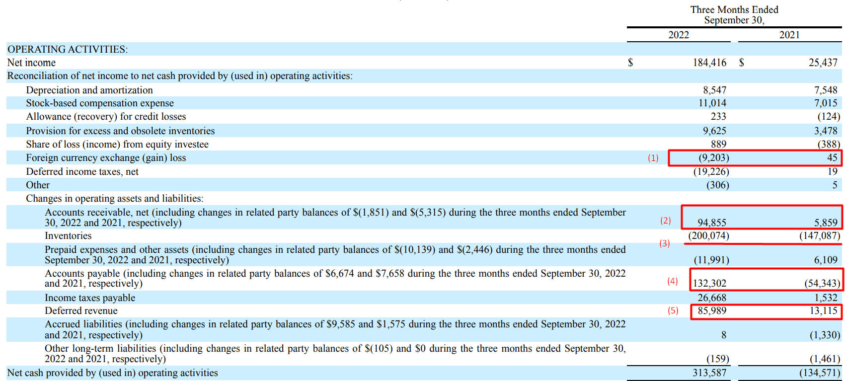 First (1), the company had a cash outflow (about $9.2M) from FX transactions in Q1 2023. I expect SMCI to have lower cash outflow in the next periods due to the revenue shift we saw this quarter (more cash will come from buyers in the US). This will have a positive impact on the level of cash flow from operating activities.