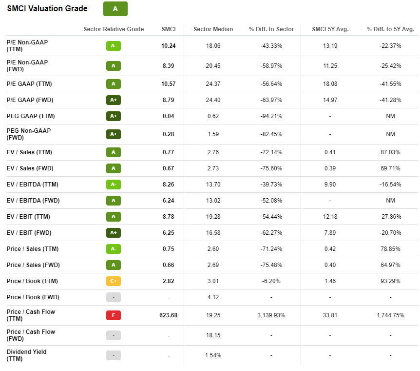 As for the company’s valuation relative to the sector, according to Seeking Alpha’s quant grade, SMCI looks like a strong “A” relative to the IT sector as a whole: