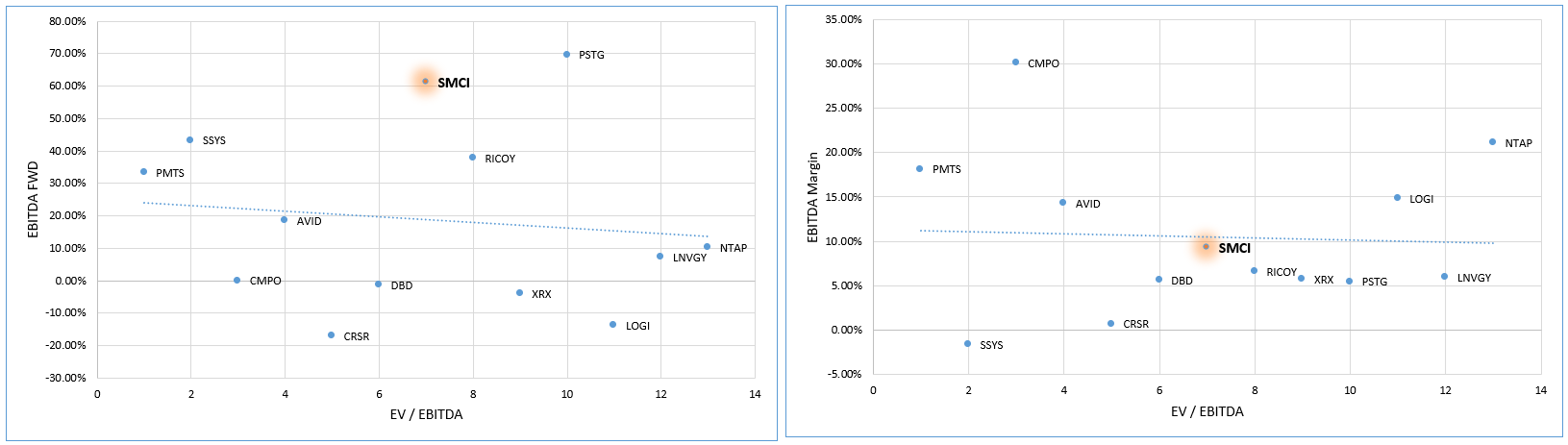 On the left chart above, I have plotted the positions of the remaining companies in the sample by forward P/E multiples (x-axis) and future revenue growth (y-axis). As we can see, SMCI is second only to Ricoh Company (OTCPK:RICOY) in terms of projected revenue growth, while the company is obviously second to none in terms of revenue growth relative to P/E. SMCI’s net margin suggests a fair valuation, and already here the company looks better than RICOY. Let’s make a similar comparison in terms of EV/EBITDA and EBITDA growth/margins.