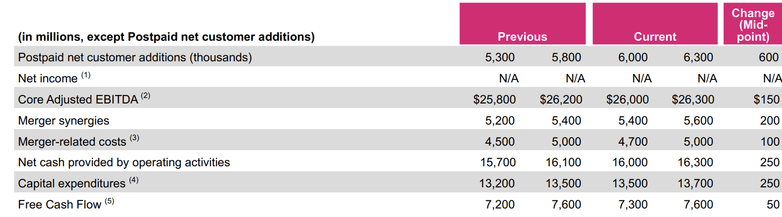 To reiterate, T-Mobile’s business is performing well as the company has taken share from Verizon and AT&T. Last quarter, it added 1.7 million postpaid customers with a churn that was below Verizon’s for the first time ever. These net adds beat VZ and T’s combined performance. This customer growth led to a 6% increase in revenue to $15.3 billion and a 10% rise in core EBITDA to $6.6 billion. Free cash flow was a strong $1.8 billion.