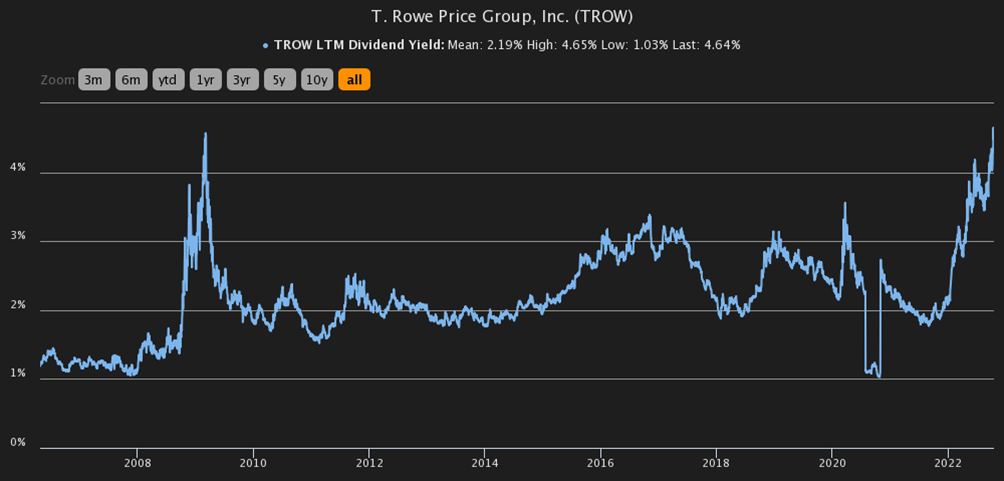 In light of these considerations, I cannot find a weakness in this dividend. It is broadly sustainable, exhibits rapid and steady growth. Moreover, as we have seen previously, the dividend yield is almost close to 5%, a figure seen only during the 2008 crisis. Often when we talk about dividends the first ones that come to mind are companies like Coca Cola (KO), Procter & Gamble (PG), or Pepsi (PEP), but I honestly wonder what T. Rowe Price has less than the latter in terms of dividend quality. With this I do not mean to disparage the companies mentioned, but I do want to point out that T. Rowe Price is unfairly underfollowed, and you can observe this even from the few followers here on Seeking Alpha.
