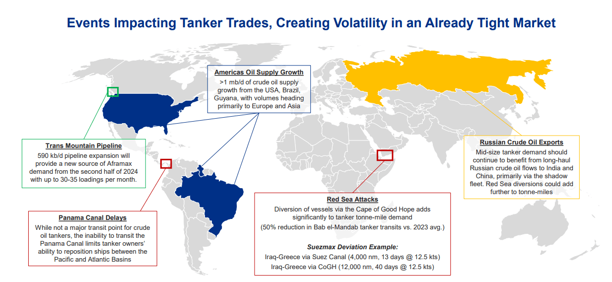 The shipping industry has been one of the best-performing sectors in recent years, benefiting from the general shortage of large vessels after years of low industry investment. The oil tanker industry has had a solid performance, gaining from both the shortage of shipping vessels and the increased need for global oil transportation amid the geopolitical and economic breakdown of certain trade relationships, notably, oil exports from Russia to Europe and the ongoing disruptions in the Red Sea.