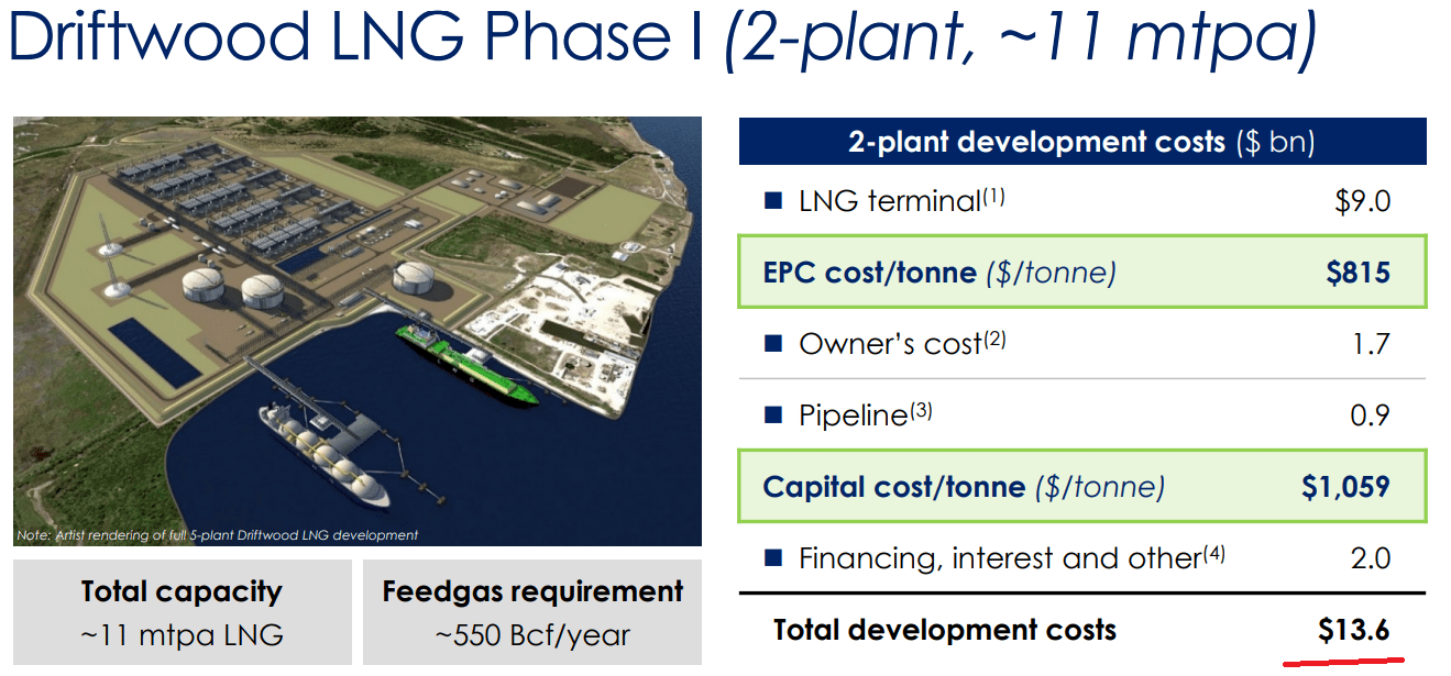 As you can see above, Tellurian’s Driftwood is expected to cost approximately $14 billion.