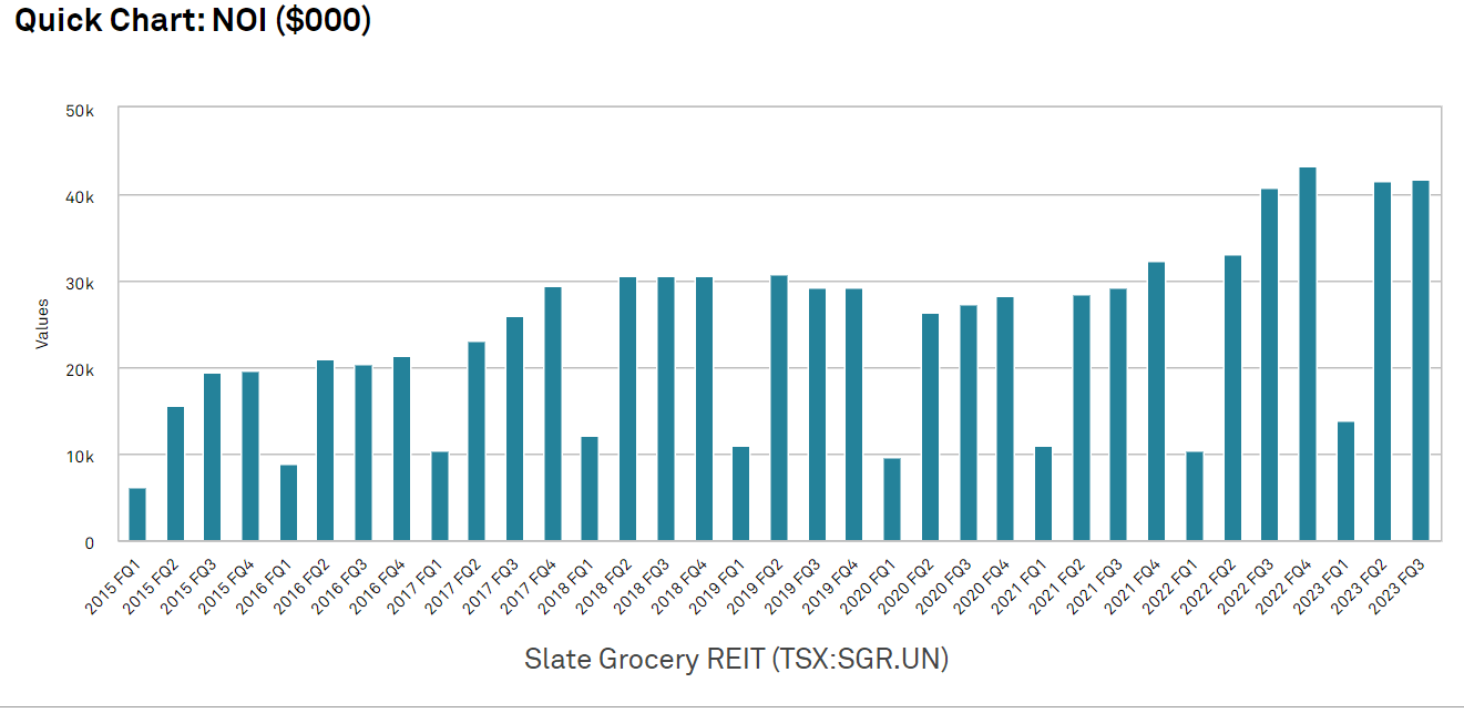 Given the payout ratio above, Slate’s current level of NOI is enough to sustain the dividend, but it behooves us to look at the stability of that level of NOI.
