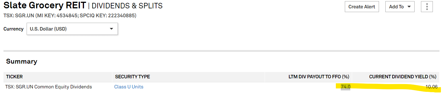 Let us look at Slate Grocery REIT (SRRTF) in regard to these parameters. Slate owns a $2.4B grocery anchored retail portfolio. The current earnings cleanly support the dividend with a payout ratio of 74%