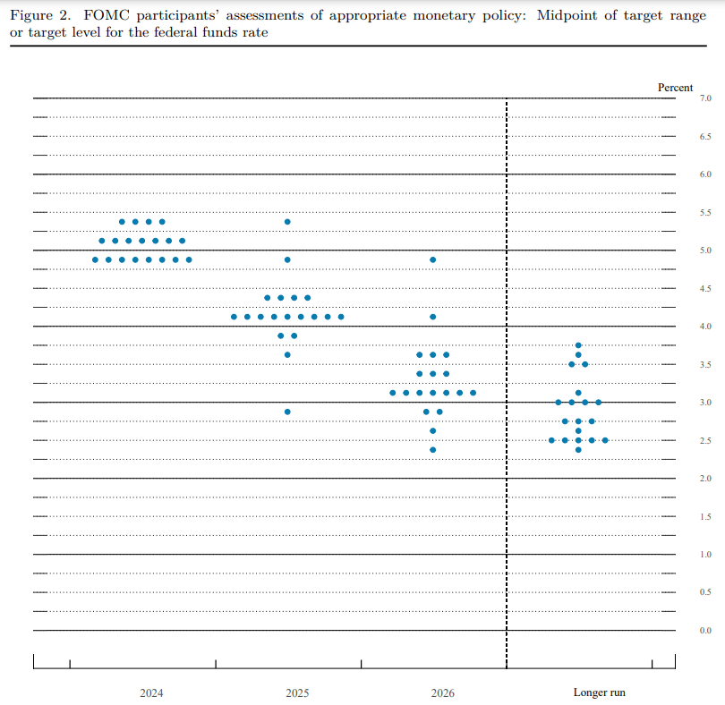 As for interest rates, the Fed’s last dot plot indicated that, of the 19 FOMC participants, 8 expect a 50 bps cut in 2024, which will bring the fed funds target rate down to 4.75% to 5%. 7 of them are looking at only 25 bps, and 4 don’t even expect a rate cut this year.