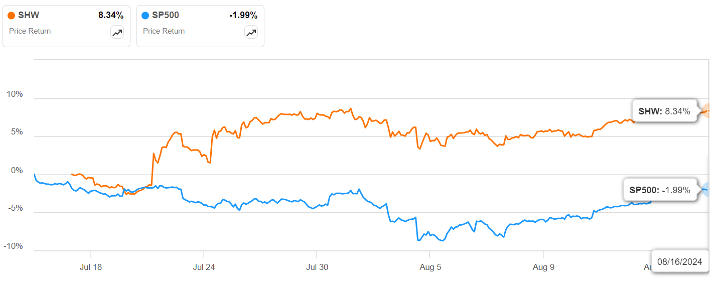 There’s no doubt SHW is a boring investment. It’s like watching paint dry, ironically. You won’t see the kind of wild volatility shown by more boisterous growth stocks the way you’d see in the technology sector, for example; rather, you can expect a more muted response to news and major events that are indicative of its beta of 0.93. Although it’s not completely immune to the vagaries of the market, as a major operator in architectural and infrastructural paints, coatings, and related materials, investors can look at it as being more of a defensive stock that most portfolios today are in need of. Indeed, if you look at its price return against that of (SPY), you’ll see how resilient it can be in a downturn.