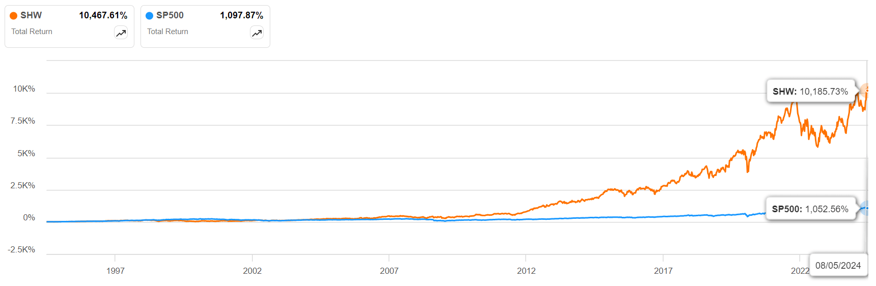 These strong cash flows are also allowing for aggressive share buybacks and a continued dividend payment. SHW has been growing its divvies for the past 45 years, and although the 1Y forward growth is expected at under 10%, the 10Y CAGR for the past decade is a solid 14.4%. The current yield itself looks quite muted at around 0.8% (TTM and forward), but that’s only because the price appreciation has been so stellar over the past several decades. If you look at it from a total return perspective, you’ll see how strongly the divvies have supported it over just the past decade alone.