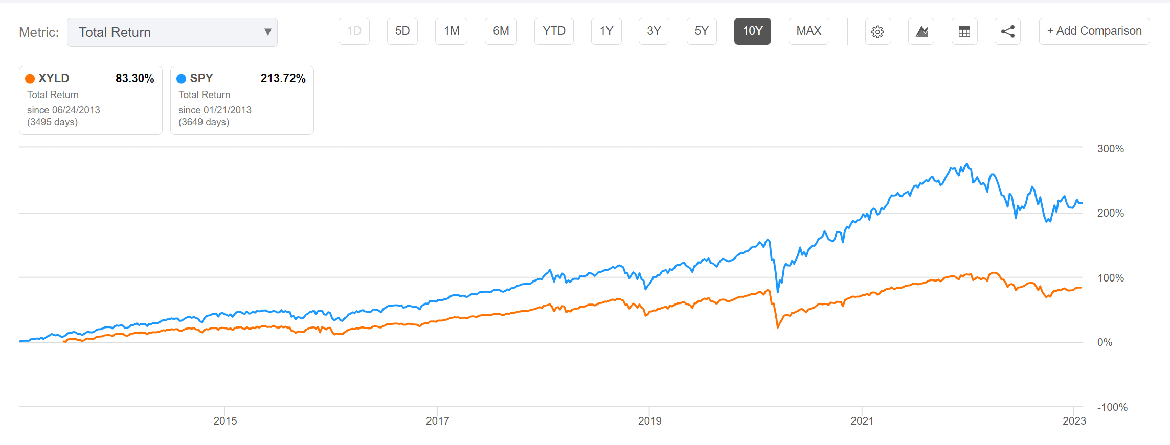 Figure 8 – XYLD has underperformed SPY by 130% over a decade (Seeking Alpha)