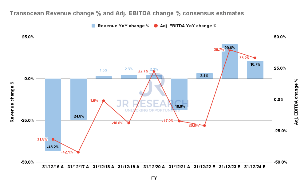 As seen above, Street analysts are confident that the cyclical recovery for Transocean remains robust, as they project sustained revenue and adjusted EBTIDA growth through FY24.
