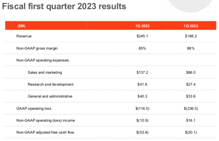 During their FQ1, the company grew revenue 32% yoy to $245 million, which beat expectations by $20 million, implying an 8% revenue beat. The company’s non-GAAP gross margin remained strong at 85%, though this was down a bit from 88% in the year-ago period. Higher wage and expense inflation certainly impacted the company’s gross margins, though investors will likely continue to see gross margins around that 85% level.