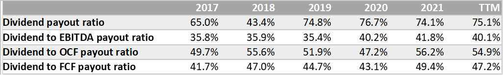 Despite the significantly high yield, the payout ratios are in safe range, as the TTM Dividend to EBITDA payout ratio is 40% and the Dividend to FCF is just 47%. During the last 5-year period, we see slow growth of payout ratios, which indicates that they still have room to grow.