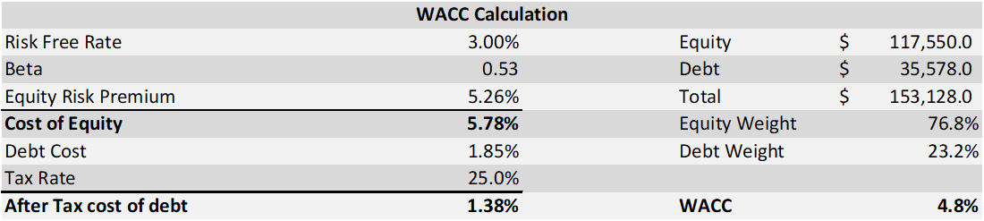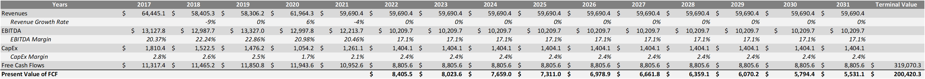 For the remaining inputs, we used a more conservative approach. We assumed a 20% lower EBITDA margin than the 2017-2021 period average, and we expect CapEx to remain consistent. We picked 2% as the final growth rate, which is lower than the current 10-year treasury yield.