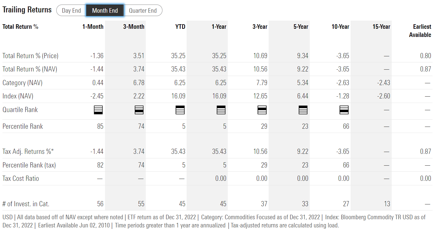 On a trailing 1Yr and 3Yr basis to December 31, 2022, the BNO fund has delivered strong average annual returns of 35.4% and 10.6%, despite the painful drop in the early months of 2020 at the beginning of the COVID pandemic (Figure 6). Long-term 10Yr returns for BNO have been poor, as crude oil is still trading below its peak price from the commodity supercycle.