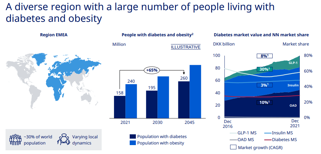 Saxenda, its obesity medication, controls a staggering 65% of the global market for Obesity, a market with a TAM of $1.5B of 650M people. Only 15M of them is being treated, meaning this is a massive opportunity, and the company expects the number of patients to increase by 10M by 2025.