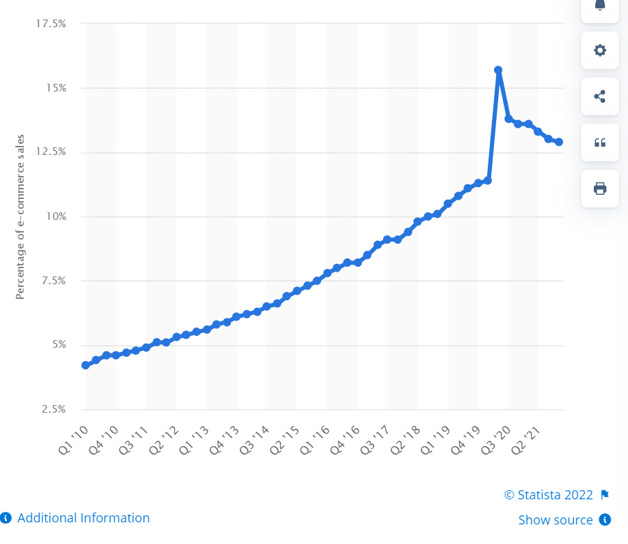 We’re so used to seeing UPS, FedEx (FDX), and Amazon (AMZN) Prime trucks on the road that we often assume that e-commerce has taken over physical retail. The actual stats about how much of the annual retail spend is attributed to e-commerce is quite interesting. In the United States, since Q1 2010, the total market share of retail sales that e-commerce represents has grown from 4.2% to 12.9% at the end of Q4 2021. In Q2 of 2020, e-commerce sales in the United States reached their highest level as the percentage of retail sales it represented was 15.7%, an increase of 4.3% from Q1 2020 11.4% level. As the United States reopened, e-commerce saw decreases in market share from its Q2 2020 peaks but still remained above the 11.4% level in Q1 of 2020. It looks like e-commerce is leveling off, representing 13% of retail sales in Q3 2021 and 12.9% in Q4 2021 within the United States. For many, this could be shocking as it may feel as if your normal shopping habits have trended toward online purchases over the past several years. The first time I looked at these stats, it was certainly surprising, but not as surprising as the projections over the next several years.