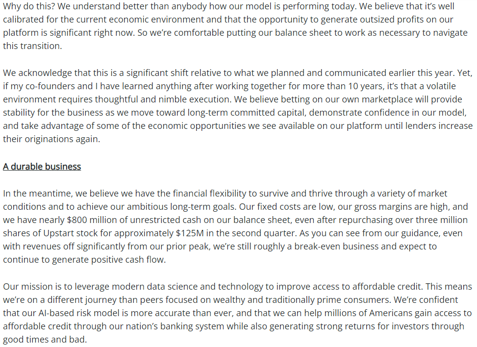 Frankly speaking, I am not entirely surprised with management’s decision to evolve Upstart’s business model to inculcate stable funding. Well, if I were running Upstart, I would want stable funding too (especially during a downturn in debt markets).
