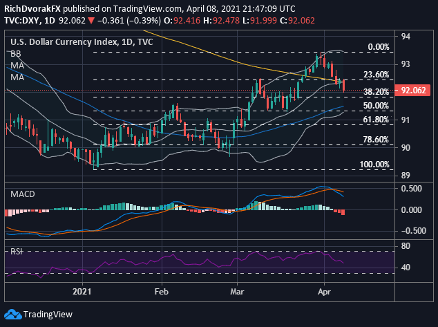 Recent EUR/USD buying pressure has largely helped US Dollar bears claw back about one-third of the 3.7% gain recorded by the DXY Index during 1Q-2021. This is seeing that EUR/USD is the largest component of DXY Index performance with a 57.6% weight. That said, declining Treasury yields could be a primary driver weighing negatively on the broader US Dollar. Fed speeches continue to express how FOMC officials remain resolute in their pursuit to keep monetary policy accommodative as well. US Dollar bears thus might try to extend the pullback with sights set on the 38.2% Fibonacci retracement and 50-day simple moving average.