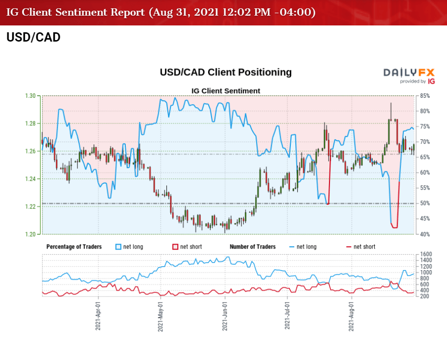 The IG Client Sentiment report shows 74.00% of traders arenet-long USD/CAD following the pullback from the monthly high (1.2949), with the ratio of traders long to short standing at 2.85 to 1.