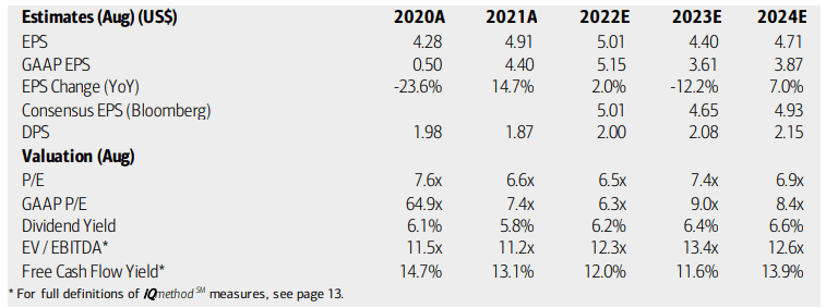 On valuation, analysts at BofA see 2022 earnings having fallen 2% while next year’s EPS should see an even larger annual decline. Both the Bloomberg consensus forecast and BofA’s outlook call for a slight per-share profit growth rate in 2024, though. While earnings growth is quite soft in the years ahead, WBA’s dividend is seen as growing through 2024 as free cash flow actually remains healthy.