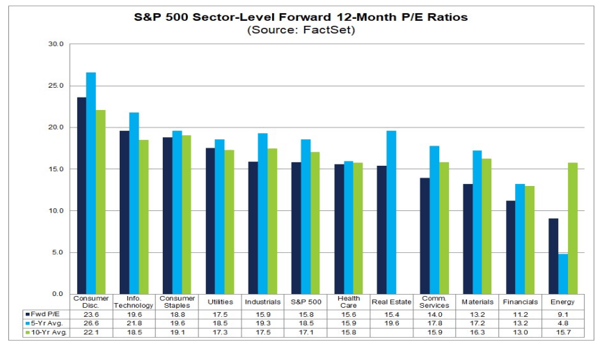 The Consumer Staples sector is now the third most expensive area in the stock market with a forward earnings multiple of 18.8, but that’s below both its average 5-year and 10-year next 12-month valuation ratios, according to John Butters at FactSet.