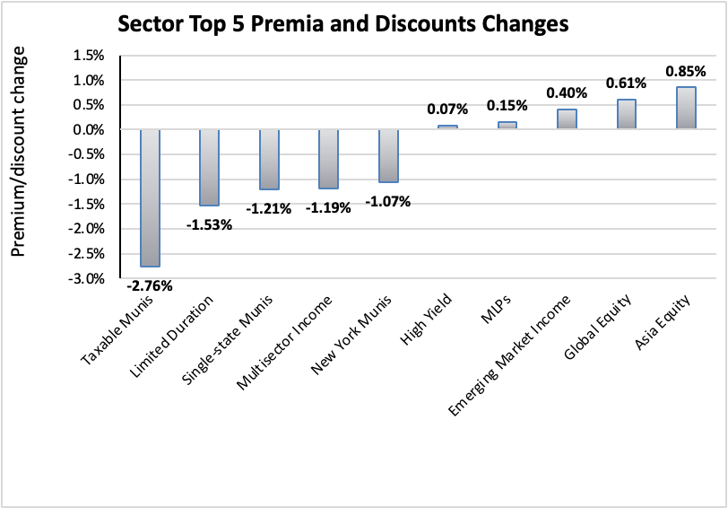 The sector with the highest premium/discount increase was Asia Equity (+0.85%), while Taxable Munis (-2.76%) showed the lowest premium/discount decline. The average change in premium/discount was -0.51% (down from +0.19% last week).