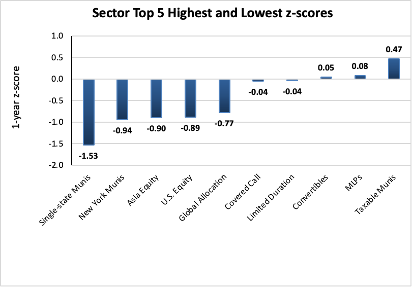 The sector with the highest premium was Taxable Munis (+0.82%), while the sector with the widest discount is MLPs (-15.38%). The average sector discount is -6.51% (down from -5.88% last week).
