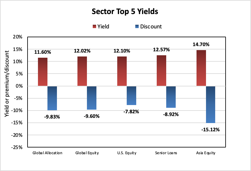 The sectors with the highest yields are Asia Equity (14.70%), Senior Loans (12.57%), and U.S. Equity (12.10%). Discounts are included for comparison. The average sector yield is 8.88% (up from 8.81% last week).