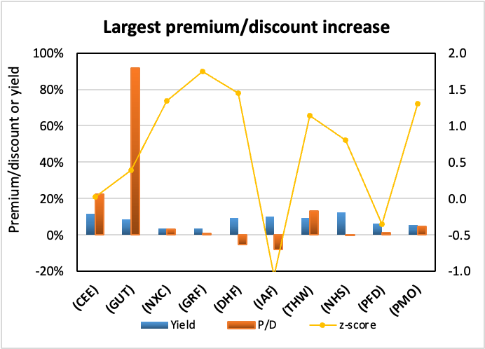 | Fund | Ticker | P/D increase | Yield | P/D | z-score | Price change | NAV change |