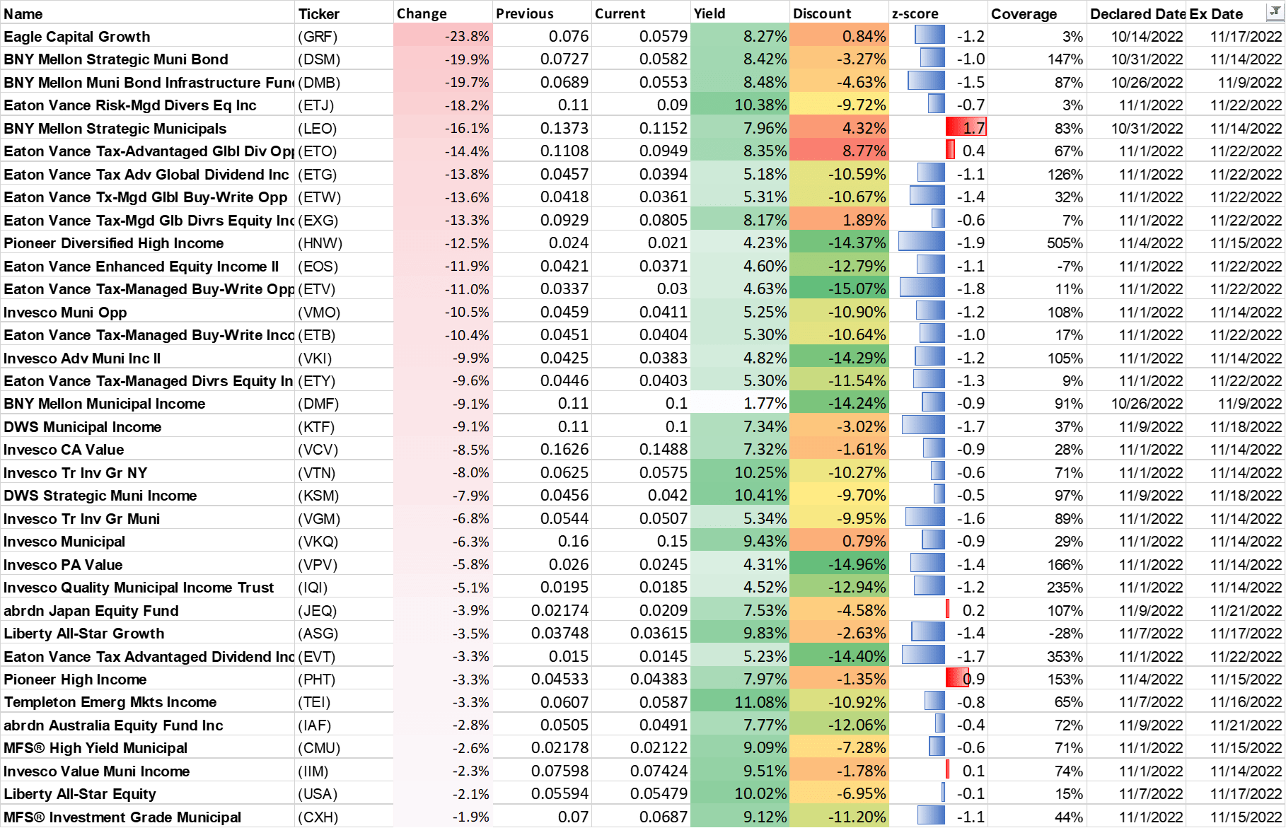 The Weekly Closed-End Fund Roundup will be put out at the start of each week to summarize recent price movements in closed-end fund [CEF] sectors in the last week, as well as to highlight recently concluded or upcoming corporate actions on CEFs, such as tender offers. Data is taken from the close of Friday, November 18th, 2022.