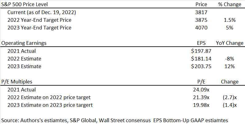 My price projections for the S&P 500 (SP500) in 2023 year-end suggest an annualized return of 5%. The table below summarizes the target trajectory as we head into 2023, showing the index projected EPS and P/E multiples.